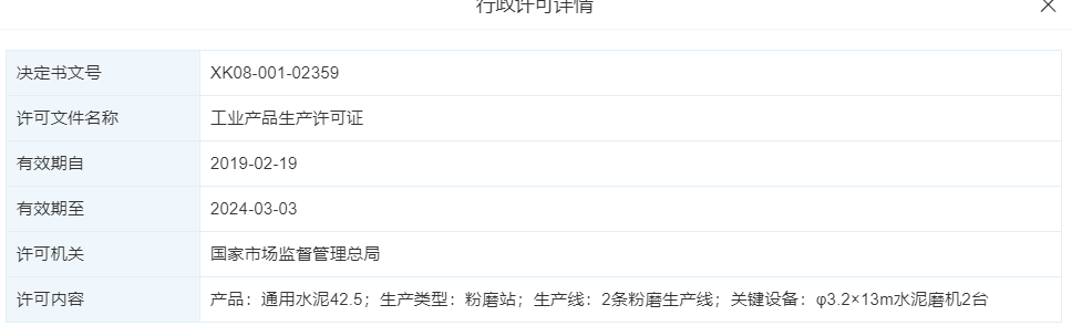 其工業(yè)品生產(chǎn)許可證(XK08-001-02359)信息顯示,企業(yè)為擁有兩條粉磨生產(chǎn)線的粉磨站,關(guān)鍵設(shè)備為φ3.2×13m水泥磨機(jī)兩臺(tái)。