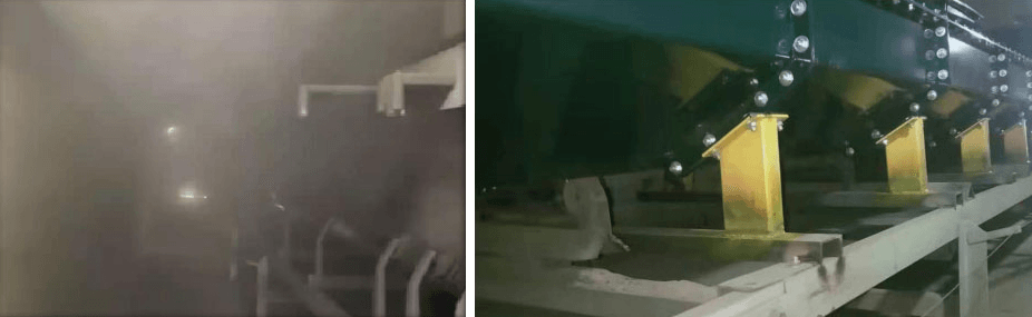 由于托輥與托輥之間有大于1米左右的間距,加之皮帶上裝載了物料,皮帶在運(yùn)行的過(guò)程中如過(guò)山車,上下抖動(dòng),物料中的粉塵在交變力作用下脫離運(yùn)送料流飛揚(yáng)到空氣中形成污染。