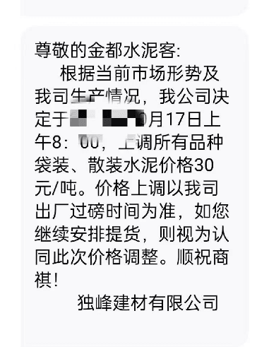 水泥人網(wǎng)通訊員消息,日前獨(dú)峰建材有限公司通知,根據(jù)當(dāng)前市場(chǎng)形勢(shì)及公司生產(chǎn)情況決定于17日上午8時(shí)起,上調(diào)所有品種袋裝、散裝水泥價(jià)格30元/噸。經(jīng)銷商提醒“18號(hào)還要漲價(jià),這情況少見(jiàn),想存貨得趕緊了”。