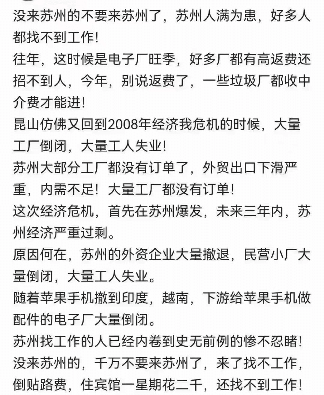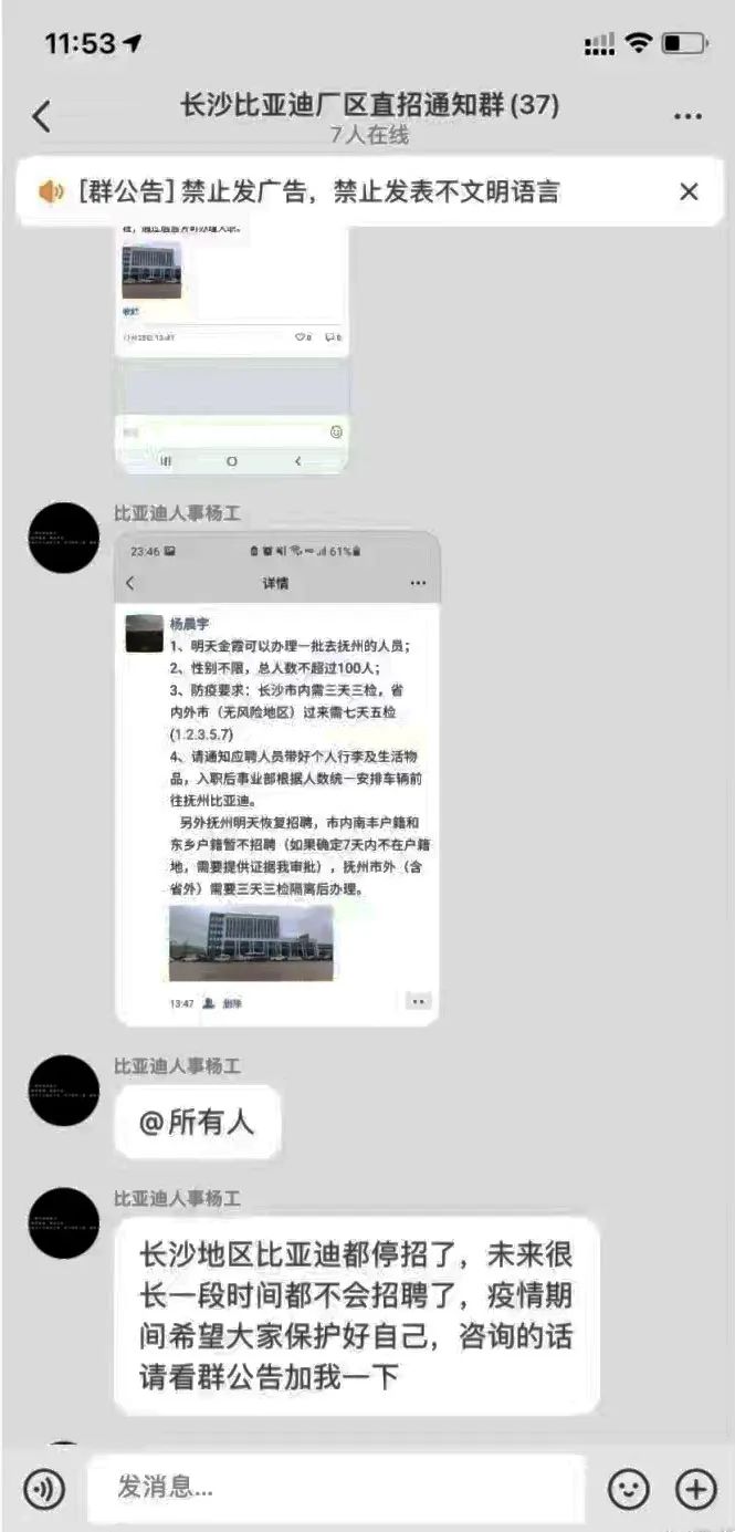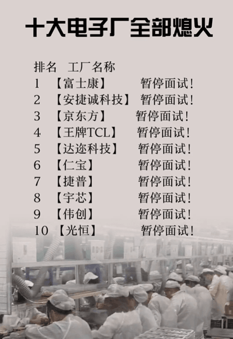 長沙比亞迪全部停招,蘋果昌碩科技暫停招募代工,蘇州立訊已經(jīng)停招,成都5大工廠(富士康、京東方、仁寶、偉創(chuàng)、捷普)基本都已“熄火”,目前現(xiàn)在廠里都飽和了,要十幾個人,都能去一百多人。