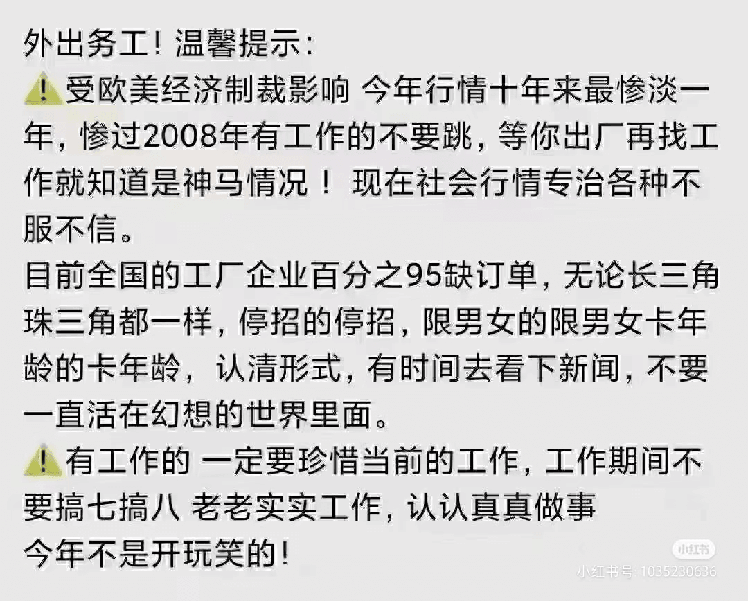 多家電子廠門口人流涌動,黑壓壓的人群并非做生意的,而是來找工作的,部分工廠錄取比例只有10%不到,且工價也不再是人人艷羨的高價了。美利達自行車廠19塊錢一小時的工價,長白班僅10個人的缺口來了300多人;新能安250個人爭搶80個崗位名額;西安高新庫柏面試現(xiàn)場,缺口幾十人,現(xiàn)場有300多人,工友表示嚴重受打擊,工資不高還挑人。