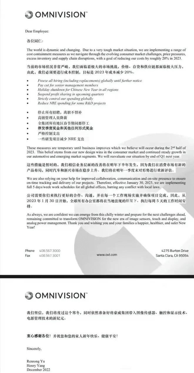 延續(xù)了近兩年的科技公司裁員潮和互聯(lián)網(wǎng)企業(yè)優(yōu)化潮仍在繼續(xù),2023年全球科技業(yè)宣布的裁員計劃總數(shù)目前已超過10萬人,接近2022年整年的裁員數(shù)量。美國芯片企業(yè)豪威集團(OmniVisionGroup)預警,2023年市場需求不樂觀,運營將面臨極大的挑戰(zhàn),宣布采用停招、降薪等一系列措施控制成本,以使明年成本減少20%,并表示這些措施是暫時的,將在明年一季度末對形勢進行重新評估。