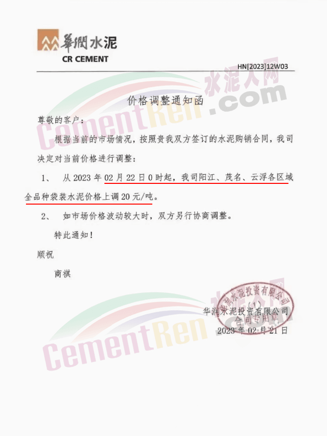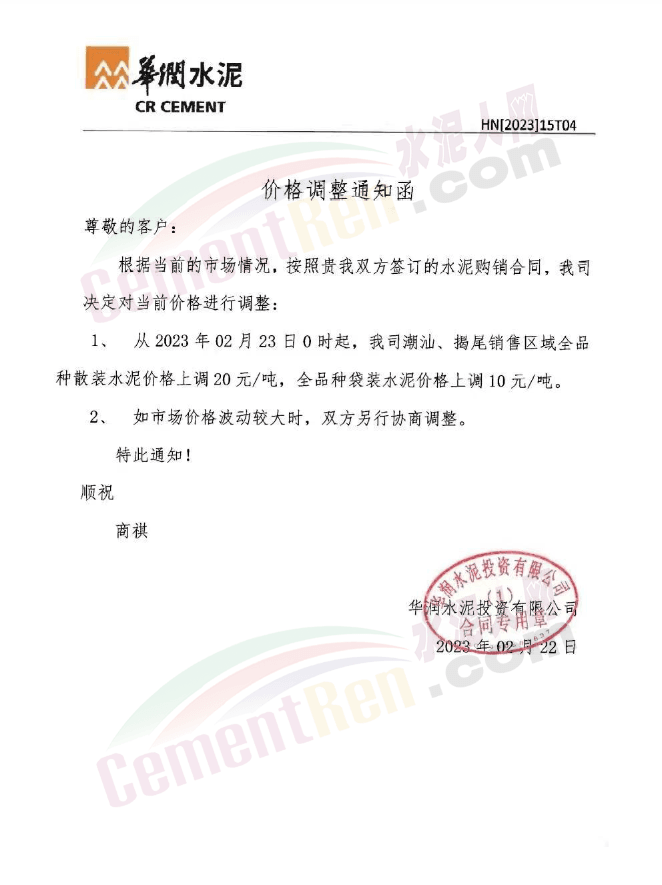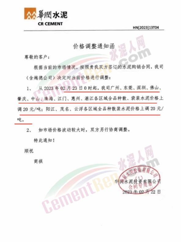 廣東區(qū)域華潤水泥投資有限公司從2023年2月23日0時(shí)起對(duì)發(fā)往以下的區(qū)域的水泥價(jià)格進(jìn)行調(diào)整。