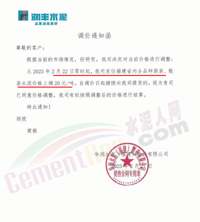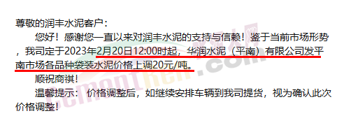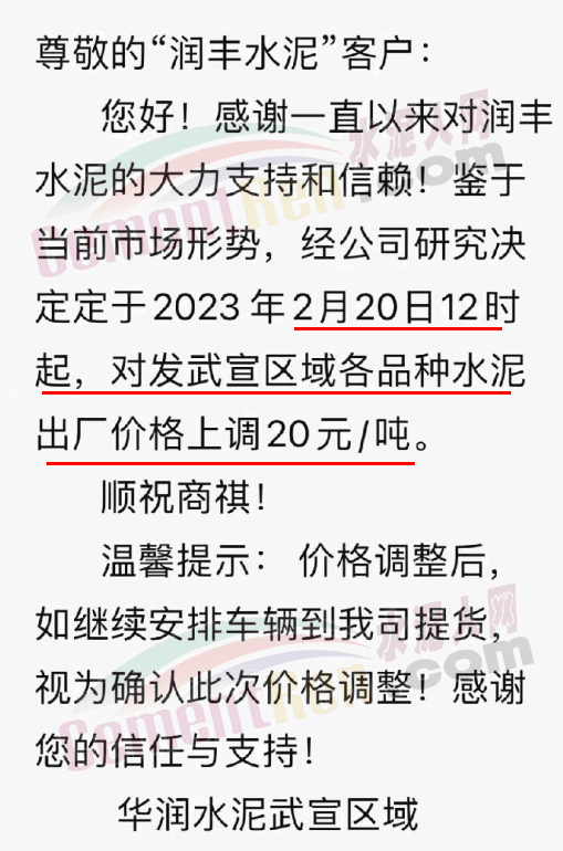 華潤水泥武宣區(qū)域通知,定于2月20日12時(shí)起,對(duì)發(fā)武宣區(qū)域各品種水泥出廠價(jià)格上調(diào)20元/噸。