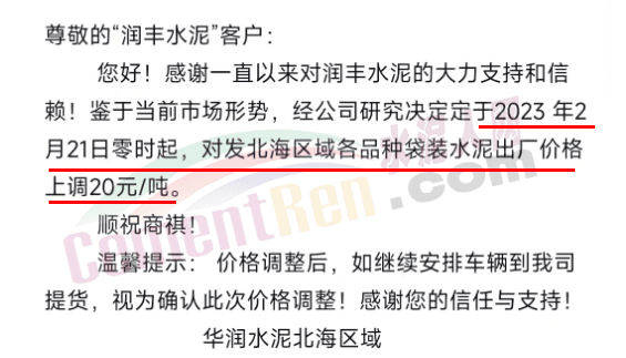華潤水泥北海區(qū)域通知,2月21日零時(shí)起,對(duì)發(fā)北海各品種袋裝水泥出廠價(jià)格上調(diào)20元/噸。