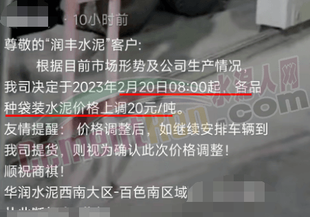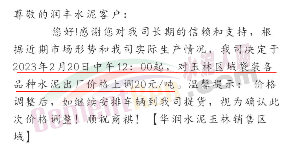 華潤水泥玉林銷售區(qū)通知,2月20日中午12時(shí)起,對(duì)玉林區(qū)域袋裝各品種水泥價(jià)格出廠價(jià)上調(diào)20元/噸。