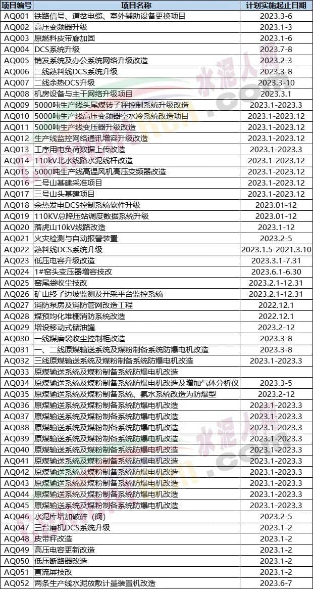 安全類項目涉及變頻器升級、皮帶廊加固、頭尾煤轉(zhuǎn)子秤控制系統(tǒng)、變頻器水冷系統(tǒng)、安全監(jiān)控網(wǎng)絡系統(tǒng)、高溫風機改造、火災檢測與自動報警裝置、窯尾收塵器技改、煤粉制備防爆系統(tǒng)、原煤輸送系統(tǒng)及煤粉制備系統(tǒng)防爆電機改造、篦冷機推雪人裝置、生產(chǎn)線皮帶機、提升機VCS開關(guān)改造、水泥庫底增加清堵破碎裝置、石灰石礦山采用一卡通無人值守稱重過磅系統(tǒng)、石灰石礦山邊坡噴錨防護混噴植草項目、能量隔離系統(tǒng)技改項目、生料配料庫技改項目、淘汰落后變壓器更換技改項目、全廠大、中型收塵器加固改造項目、中控室DCS系統(tǒng)升級改造項目改造項目、混合材堆棚構(gòu)筑物安全隱患改造項目、水泥庫底增加清堵破碎裝置、高溫風機、窯尾風機增設旁路控制項目、石灰石礦山運礦道路改道項目、總降后臺檢測保護系統(tǒng)改造、水泥庫疏堵技改項目以及礦山基建項目等。