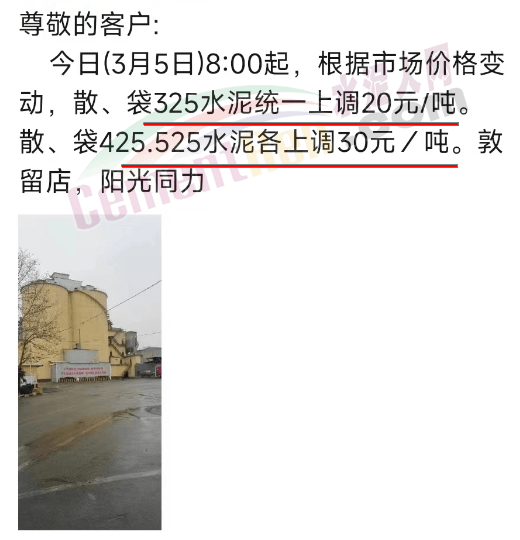 日前,河南區(qū)域陽光同力通知3月5日8時起,根據(jù)市場價格變動,散、袋32.5水泥統(tǒng)一上調20元/噸。散、袋42.5、52.5水泥各上調30元/噸。