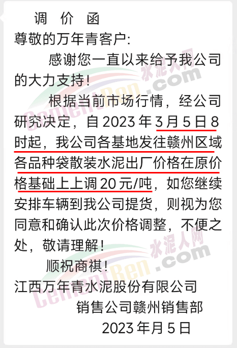 江西萬年青水泥贛州銷售部通知,根據(jù)當前市場行情,經(jīng)公司研究決定,自2023年3月5日8時起,各基地發(fā)往贛州區(qū)域各品種袋散裝水泥出廠價格在原價格基礎上上調20元/噸。