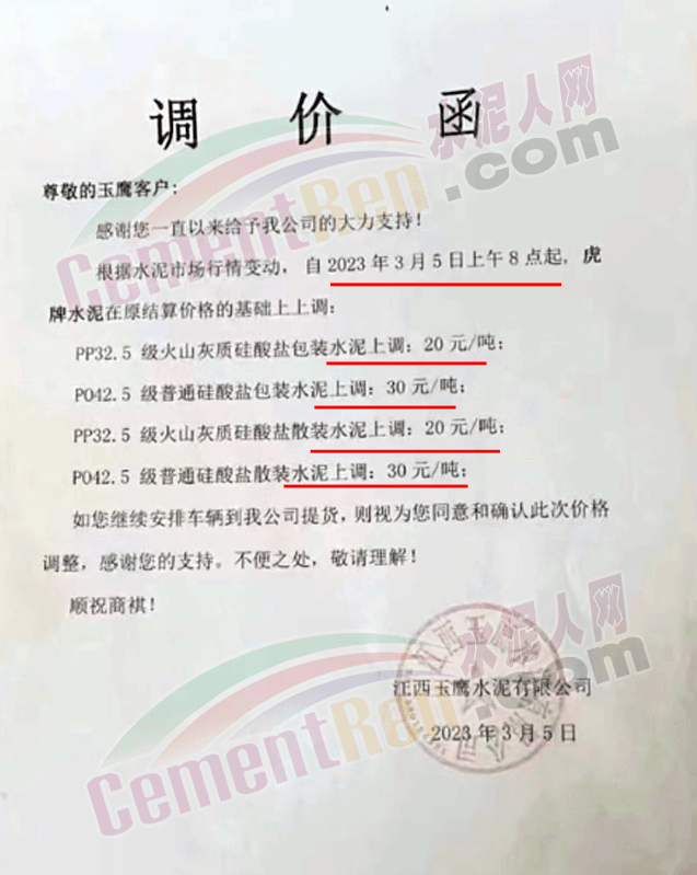 3月4日弋陽海螺通知對鷹潭、貴溪區(qū)域各品種水泥價格上調20元/噸。
