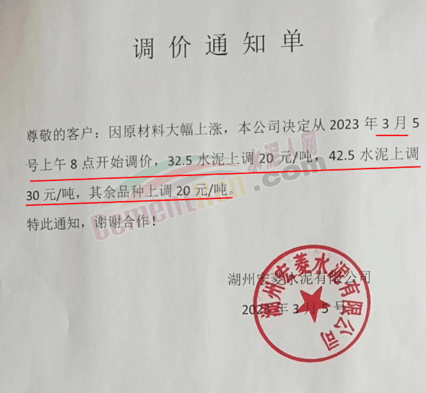 湖州市菱湖新陽水泥有限公司通知,根據(jù)當前市場行情,鑒于當前原材料上漲造成水泥生產(chǎn)成本上升經(jīng)公司研究決定,于2023年3月5日上午8時起。32.5水泥上調20元/噸,42.5水泥上調30 元/噸。