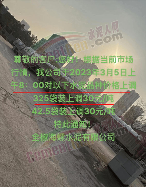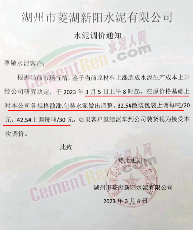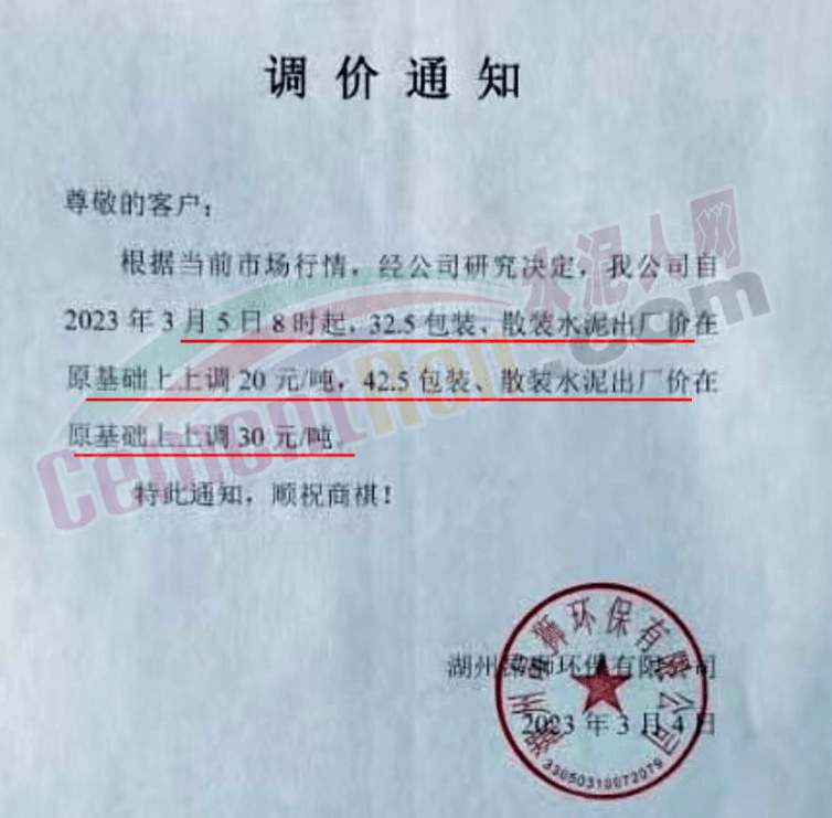 湖州昂獅環(huán)保有限公司通知,根據(jù)當前市場行情,經(jīng)公司研究決定,公司自2023年3月5日8時起,32.5包裝、散裝水泥出廠價在原基礎上上調20元/噸,42.5包裝、散裝水泥出廠價在原基礎上上調30元/噸。