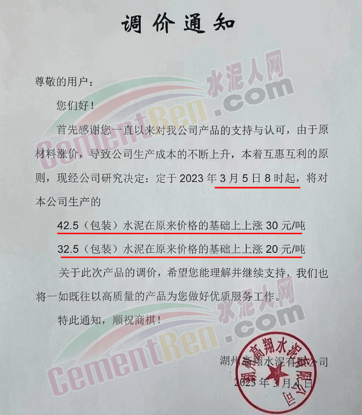 湖州高翔水泥有限公司通知,由于原材料漲價,導致公司生產(chǎn)成本的不斷上升,本著互惠互利的原則,現(xiàn)經(jīng)公司研究決定,于2023年3月5日8時起,將對本公司生產(chǎn)的42.5(包裝)水泥在原來價格的基礎上上漲 30元/噸,325(包裝)水泥在原來價格的基礎上上漲20元/噸。