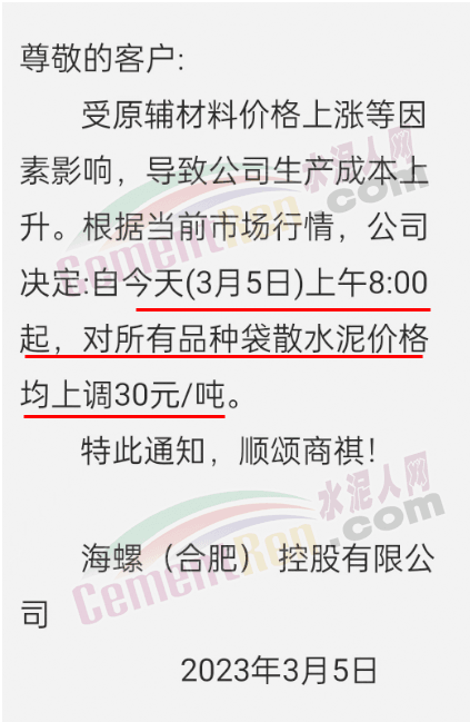 海螺(合肥)控股有限公司通知,受原輔材料價格上漲等因素影響,導致公司生產(chǎn)成本上升。根據(jù)當前市場行情,公司決定,自3月5日上午8時起,對所有品種袋散水泥價格均上調30元/噸。