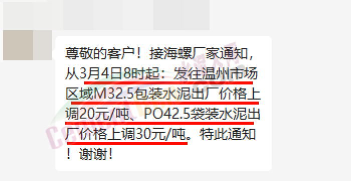 海螺經(jīng)銷商發(fā)消息稱,接海螺廠家通知,從3月4日8時(shí)起,發(fā)往溫州市場區(qū)域M32.5包裝水泥出廠價(jià)格上調(diào)20元/噸、P.O42.5袋裝水泥出廠價(jià)上調(diào)30元/噸。