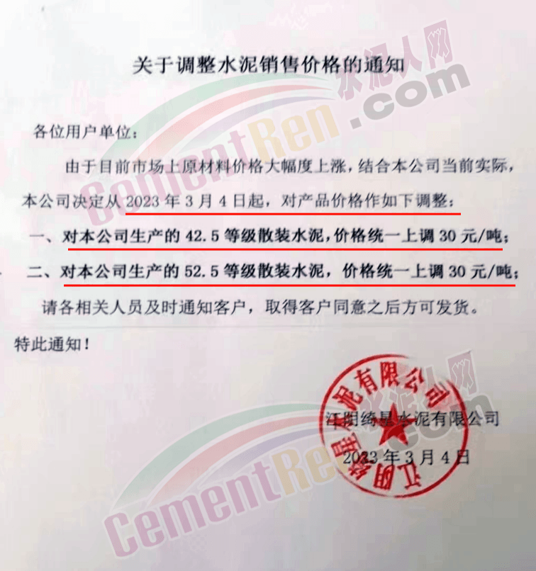 江陰綺星水泥有限公司通知,由于目前市場上原材料價(jià)格大幅度上漲,公司決定從3月4日起,對(duì)本公司生產(chǎn)的散裝水泥價(jià)格統(tǒng)一上調(diào)30元/噸。