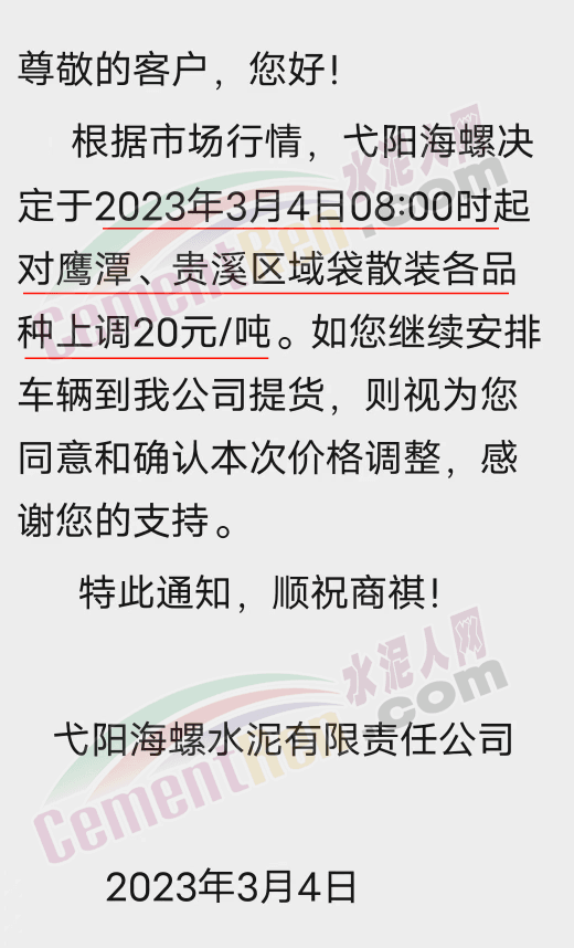 弋陽海螺通知,定于3月4日8時(shí)起對(duì)鷹潭、貴溪區(qū)域各品種水泥價(jià)格上調(diào)20元/噸。