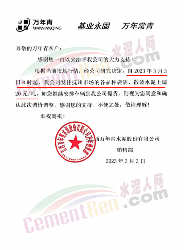 江西萬年青水泥股份有限公司通知,根據(jù)當(dāng)前市場行情,經(jīng)公司研究決定,自2023年3月3日8時(shí)起,公司發(fā)往撫州市場的各品種袋裝、散裝水泥上調(diào)20元/噸。
