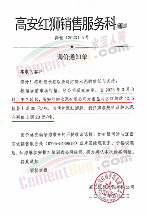 高安紅獅水泥銷售服務(wù)科通知,根據(jù)當(dāng)前市場行情,經(jīng)公司研究決定,自2023年3月3日上午7時(shí)起,高安紅獅水泥有限公司對(duì)南昌片區(qū)紅獅牌42.5散裝上調(diào)30元/噸,其他片區(qū)紅獅牌、錢江牌各規(guī)格品種水泥合同價(jià)上調(diào)20元/噸。