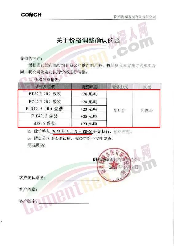 日前,陽春海螺水泥有限責(zé)任公司通知,從3月3日8時(shí)起各標(biāo)號(hào)水泥陽西縣區(qū)域出廠價(jià)上調(diào)20元/噸。