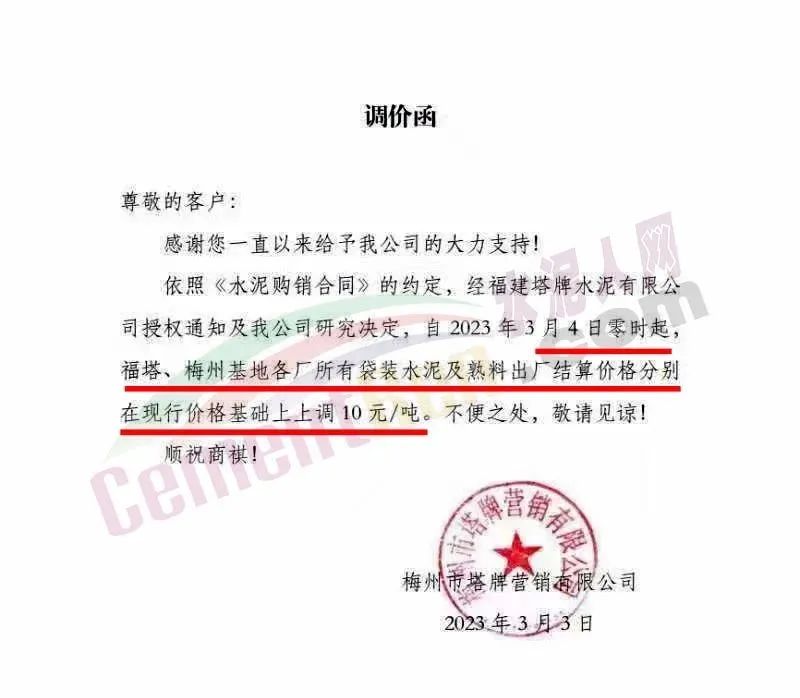 梅州市塔牌營銷有限公司通知,自3月4日零時(shí)起,福塔、梅州基地各廠所有袋裝水泥及熟料出廠結(jié)算價(jià)格上調(diào)10元/噸。