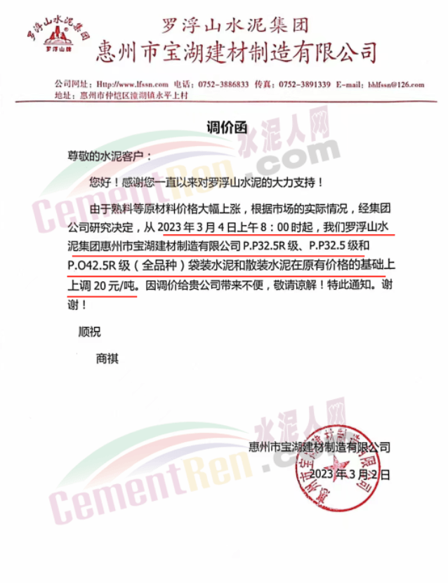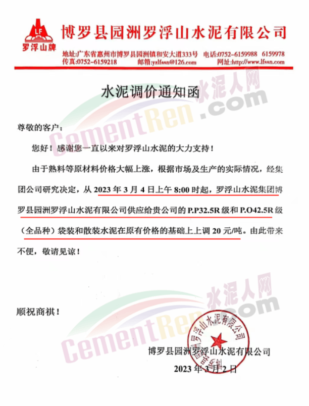 3月4日羅浮山水泥集團(tuán)惠州市寶湖建材制造有限公司、博羅縣園洲羅浮山水泥有限公司PP32.5R級(jí)PP32.5級(jí)和P.O42.5R級(jí)(全品種)袋裝水泥和散裝水泥上調(diào)20元/噸。企業(yè)曾于2月23日發(fā)函上調(diào)上述標(biāo)號(hào)水泥價(jià)格20元/噸。兩次累計(jì)上調(diào)40元/噸。