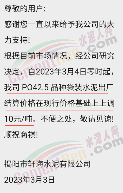 揭陽市軒海水泥有限公司通知,3月4日零時(shí)起,P.O42.5袋裝水泥出廠價(jià)上調(diào)10元/噸。