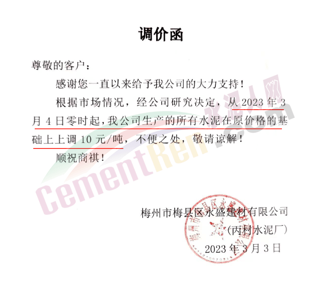 梅州市梅縣區(qū)永盛建材有限公司通知,3月4日零時(shí)起,公司生產(chǎn)的所有水泥在原價(jià)基礎(chǔ)上上調(diào)10元/噸。