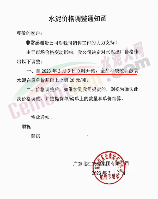 廣東北江實(shí)業(yè)集團(tuán)有限公司通知,由于市場價(jià)格變動(dòng)影響,公司決定自3月3日0時(shí)開始全品種水泥上調(diào)20元/噸。