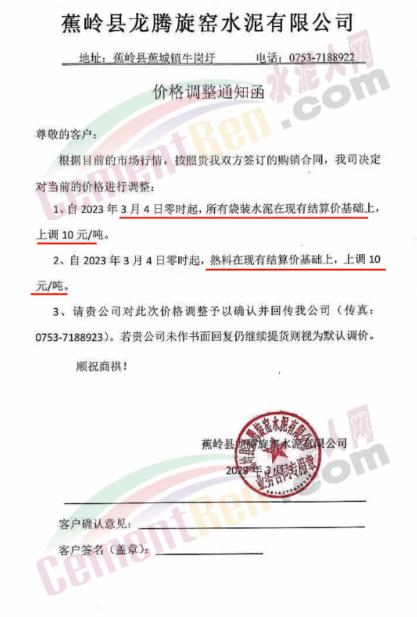 蕉嶺龍騰旋窯水泥通知,3月4日零時(shí)起,水泥及熟料價(jià)格上調(diào)10元/噸。