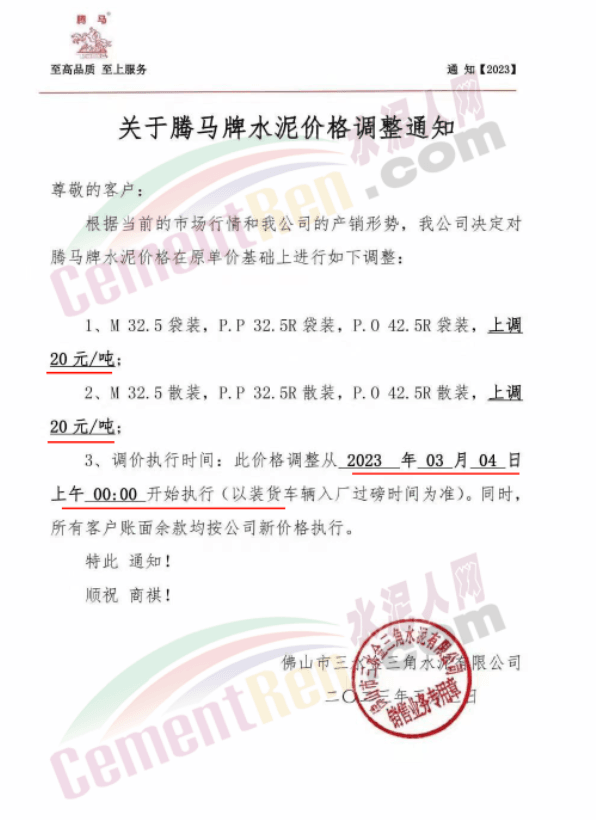 佛山市三水金三角水泥有限公司通知,3月4日起水泥價(jià)格上調(diào)20元/噸。