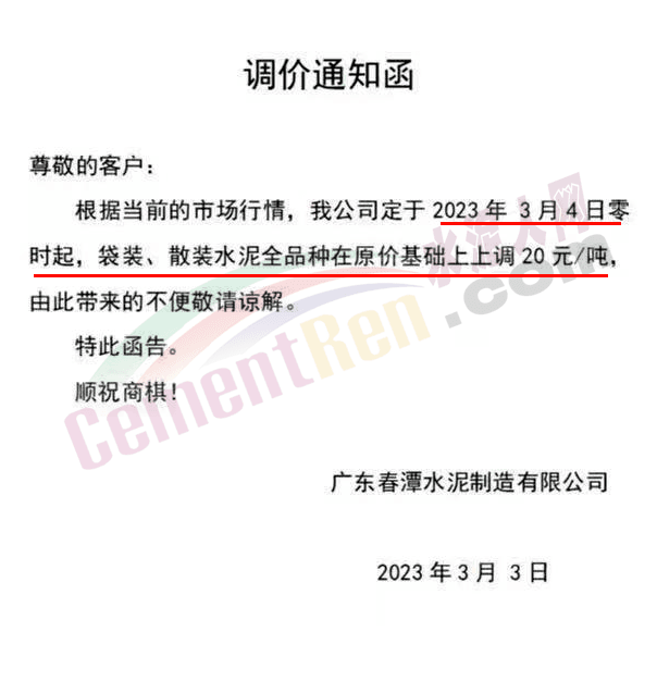 廣東春潭水泥制造有限公司通知,3月4日零時(shí)起,全品種水泥在原基礎(chǔ)上上調(diào)20元/噸。
