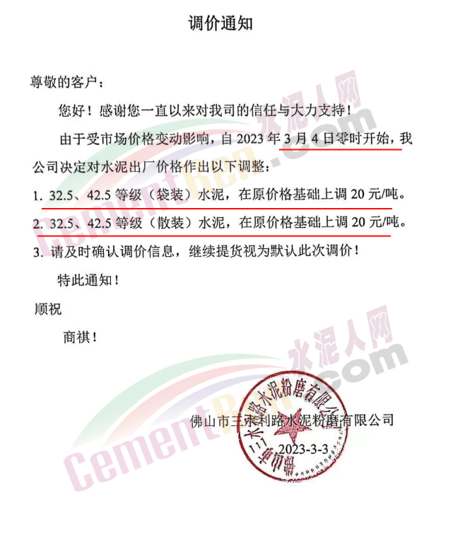 佛山市三水利路水泥粉磨有限公司通知,3月4日零時(shí)開始各標(biāo)號(hào)水泥上調(diào)20元/噸。