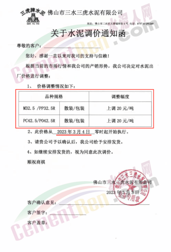 佛山市三水三虎水泥通知,3月4日零時(shí)起各標(biāo)號(hào)水泥上調(diào)20元/噸。