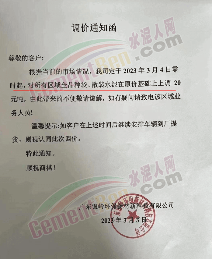 廣東銀嶺環(huán)保新材料科技有限公司通知,3月4日對(duì)全區(qū)域水泥價(jià)格上調(diào)20元/噸。