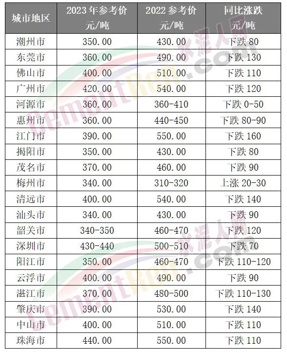 從上述數(shù)據(jù)可見江門區(qū)域2022年3月初報(bào)價(jià)在550元/噸,目前參考報(bào)價(jià)還不到400元/噸。梅州市場上年同期報(bào)價(jià)在310-320元/噸左右,今年3月初報(bào)價(jià)340元/噸左右,若考慮成本上漲因素,該報(bào)價(jià)與上年同期仍有差距。