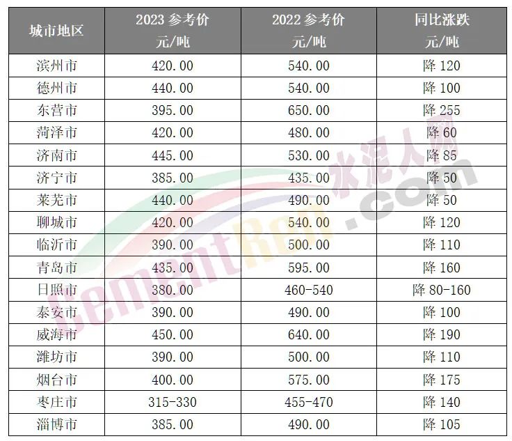水泥人網(wǎng)信息中心數(shù)據(jù)顯示,山東東營水泥價(jià)格較上年同期大跌255元/噸,威海、煙臺(tái)水泥價(jià)格跌190元/噸、170元/噸;日照今年3月初較上年同期報(bào)價(jià)下跌80-160元/噸,棗莊區(qū)域水泥價(jià)格也下跌了140元/噸左右。