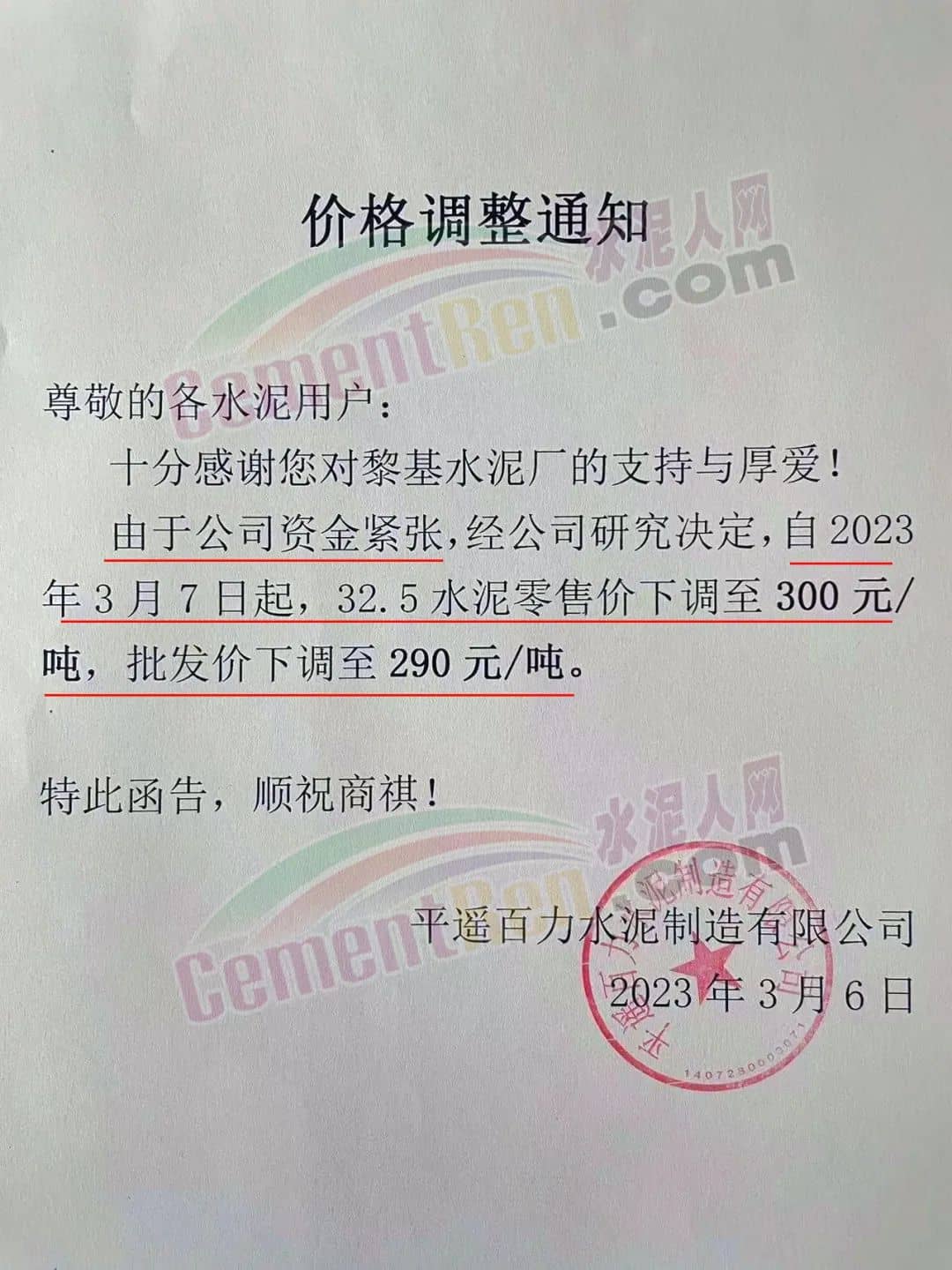 但是,平遙百力水泥制造有限公司卻發(fā)了張“降價函”。企業(yè)價格調整通知稱,由于公司資金緊張,自2023年3月7日起,32.5水泥零售價下調至300 元/噸,批發(fā)價下調至290元/噸。