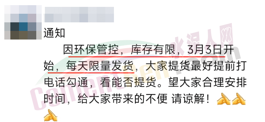 另據水泥人網此前消息,山西長治的一家水泥企業(yè)曾發(fā)出通知稱環(huán)保管控,庫存有限,即日起限量發(fā)貨,提貨需提前預約。