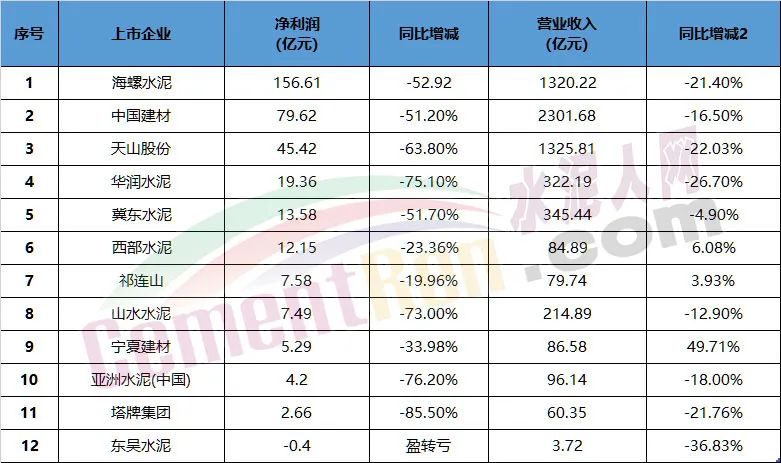 近期12家水泥上市公司先后發(fā)布了2022年度業(yè)績報(bào)告,其中包括海螺水泥、冀東水泥、華潤水泥在內(nèi)的9家水泥上市公司呈現(xiàn)營收、利潤額雙下滑的情況,西部水泥、祁連山、寧夏建材3家上市公司出現(xiàn)增收不增利的情況。