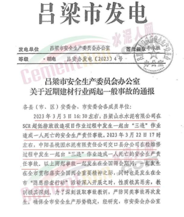 據(jù)呂梁市安全生產(chǎn)委員會(huì)辦公室通報(bào):2023年3月3日16:30左右,呂梁山水水泥有限公司在SCR超低排放改造項(xiàng)目作業(yè)過(guò)程中發(fā)生一起由“三違”作業(yè)造成一人死亡的安全生產(chǎn)責(zé)任事故。