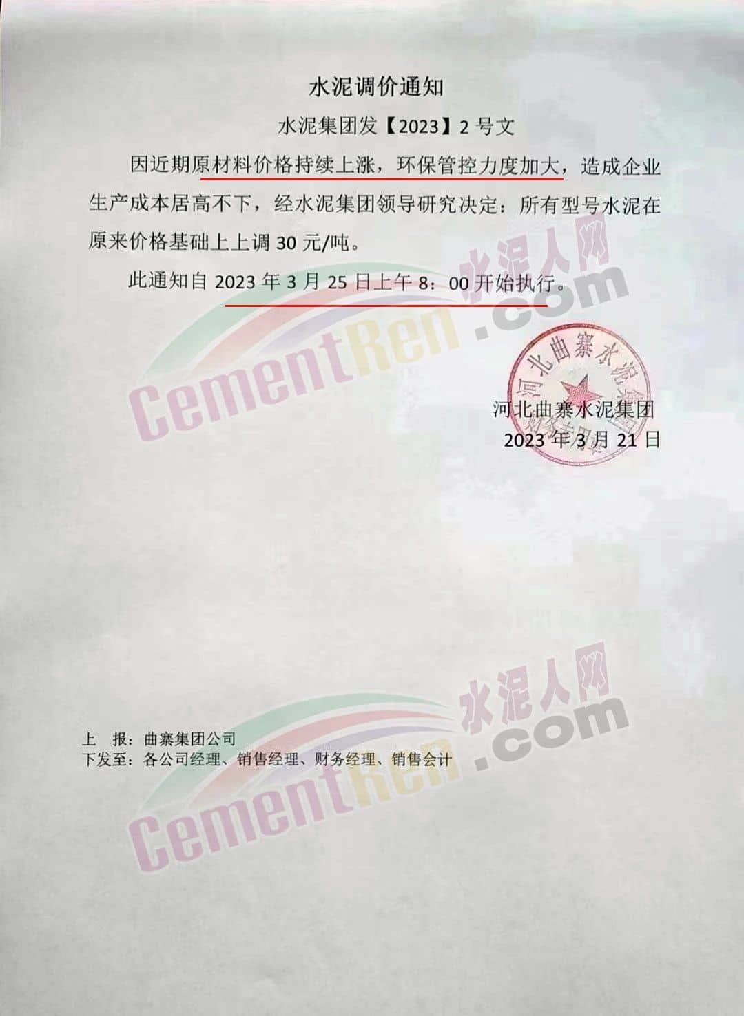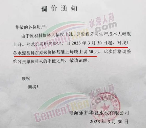青海樂都華夏水泥有限公司通知,由于原材料價(jià)格大幅度上漲,導(dǎo)致我公司生產(chǎn)成本大幅度上升。經(jīng)總公司研究決定,自2023年3月30日起,對(duì)公司各水泥品種在原來(lái)價(jià)格基礎(chǔ)上每噸上調(diào)30元。
