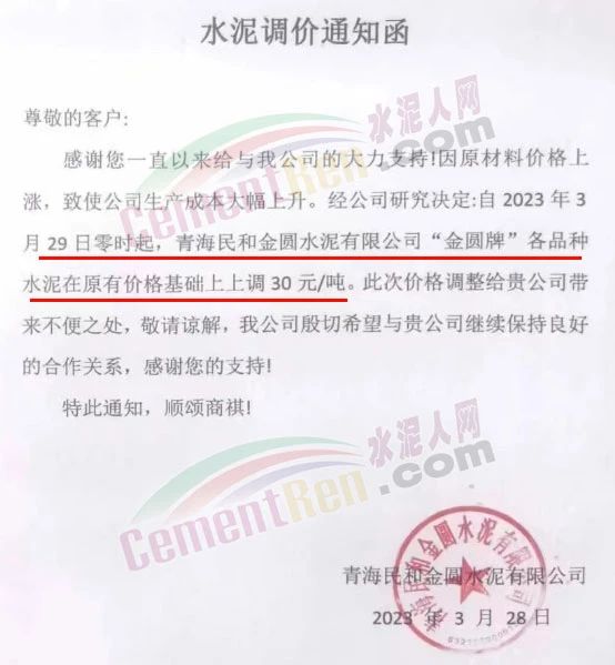 青海民和金圓水泥有限公司通知,因原材料價(jià)格上漲,致使公司生產(chǎn)成本大幅上升。經(jīng)公司研究決定自2023年3月29日零時(shí)起,青海民和金圓水泥有限公司“金圓牌”各品種水泥在原有價(jià)格基礎(chǔ)上上調(diào)30元/噸。