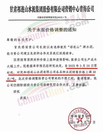 甘肅祁連山水泥集團(tuán)股份有限公司營(yíng)中心青海公司通知,因原煤等原燃材料價(jià)格上漲和疫情影響,致使公司生產(chǎn)成本大幅上升?,F(xiàn)根據(jù)庫(kù)存情況經(jīng)研究決定,自2023年3月28日零時(shí)起,對(duì)民和祁連山水泥有限公司各品種水泥銷售價(jià)格上調(diào)30元/噸。