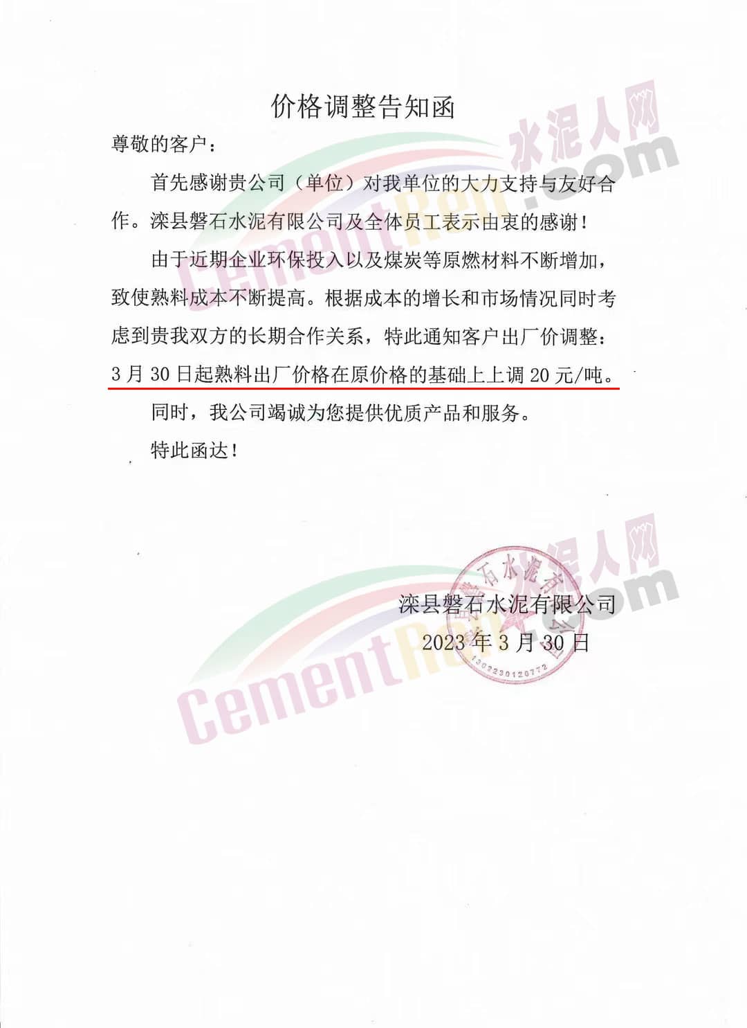 唐山圣龍水泥有限公司通知,由于近期企業(yè)環(huán)保投入以及煤炭等原燃材料不斷增加,致使熟料成本不斷提高。自2023年3月30日8時(shí)起熟料產(chǎn)品出廠價(jià)格在原價(jià)格基礎(chǔ)上每噸上調(diào)20 元。