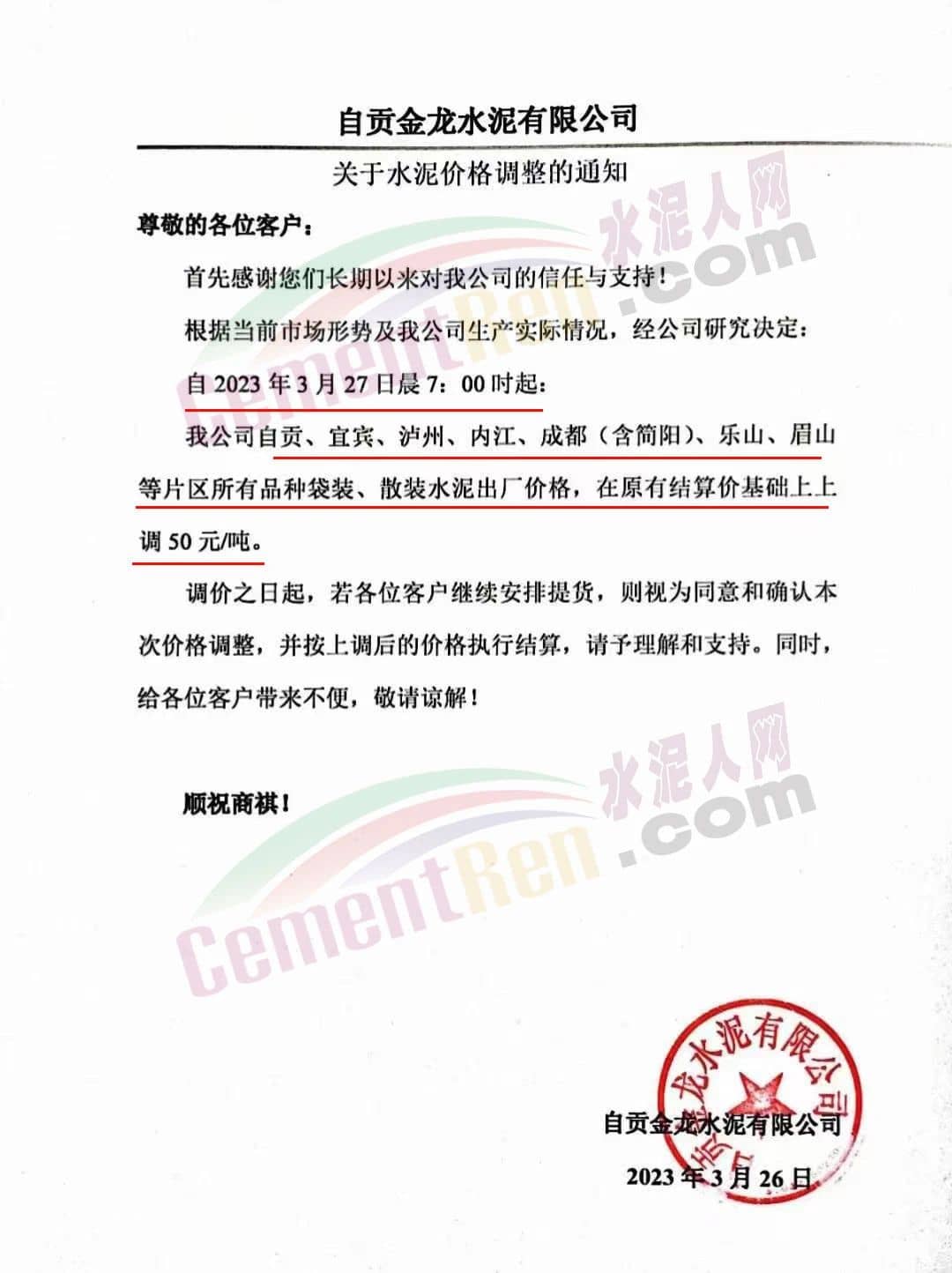 自貢金龍水泥有限公司通知,根據(jù)當(dāng)前市場(chǎng)形勢(shì)及我公司生產(chǎn)實(shí)際情況,經(jīng)公司研究決定自2023年3月27日晨7時(shí)起,自貢、宜賓、瀘州、內(nèi)江、成都(含簡(jiǎn)陽(yáng))、樂山、眉山等片區(qū)所有品種袋裝、散裝水泥出廠價(jià)格,在原有結(jié)算價(jià)基礎(chǔ)上上調(diào)50元/噸。