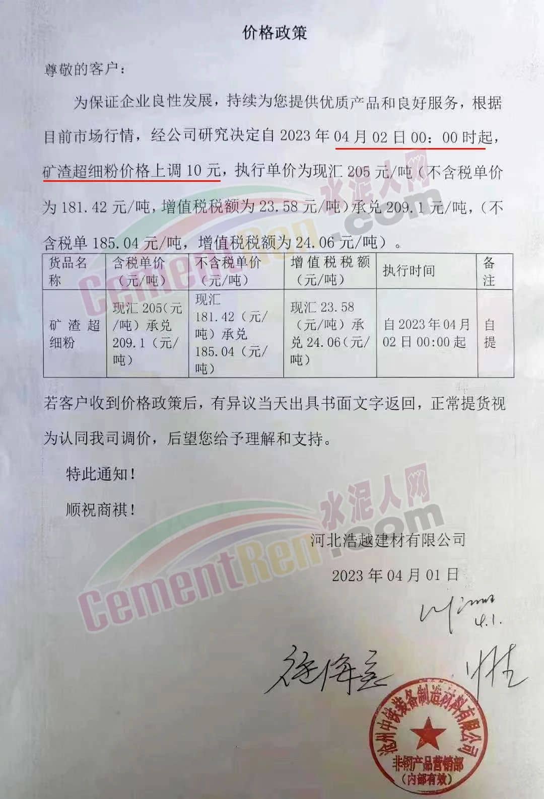 河北浩越建材有限公司通知,根據(jù)目前市場(chǎng)行情,經(jīng)公司研究決定自2023年4月2日0時(shí)起礦渣超細(xì)粉價(jià)格上調(diào)10元/噸。