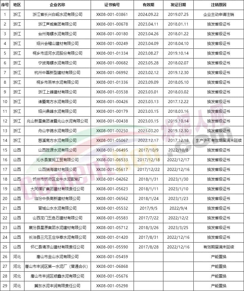 據(jù)查詢,近期浙江、河南、山西三省市場監(jiān)管部門發(fā)布了注銷水泥企業(yè)生產許可通告,近30家企業(yè)生產許可證被注銷。