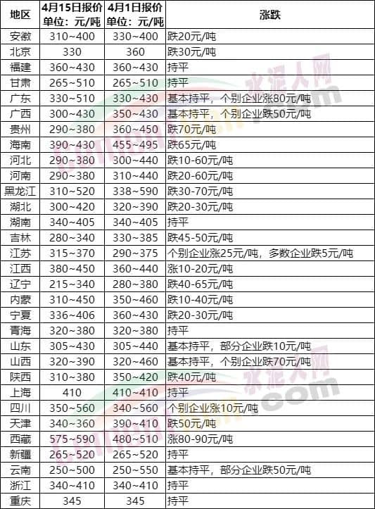 從水泥人網(wǎng)信息中心數(shù)據(jù)可見(jiàn),4月份以來(lái)全國(guó)31個(gè)省市自治區(qū)內(nèi)北京、天津、安徽、廣西、貴州、海南、河北、河南、黑龍江、湖北、吉林、江蘇、遼寧、內(nèi)蒙古、寧夏、山東、山西、陜西、云南等20多個(gè)省市地區(qū)水泥價(jià)格出現(xiàn)下跌。其中廣西、貴州、海南、河北、河南、黑龍江、吉林、江蘇、遼寧、山東、山西、云南13個(gè)省市地區(qū)水泥價(jià)格出現(xiàn)50元/噸以上的下跌,貴州、山西、黑龍江個(gè)別企業(yè)下跌達(dá)70元/噸。