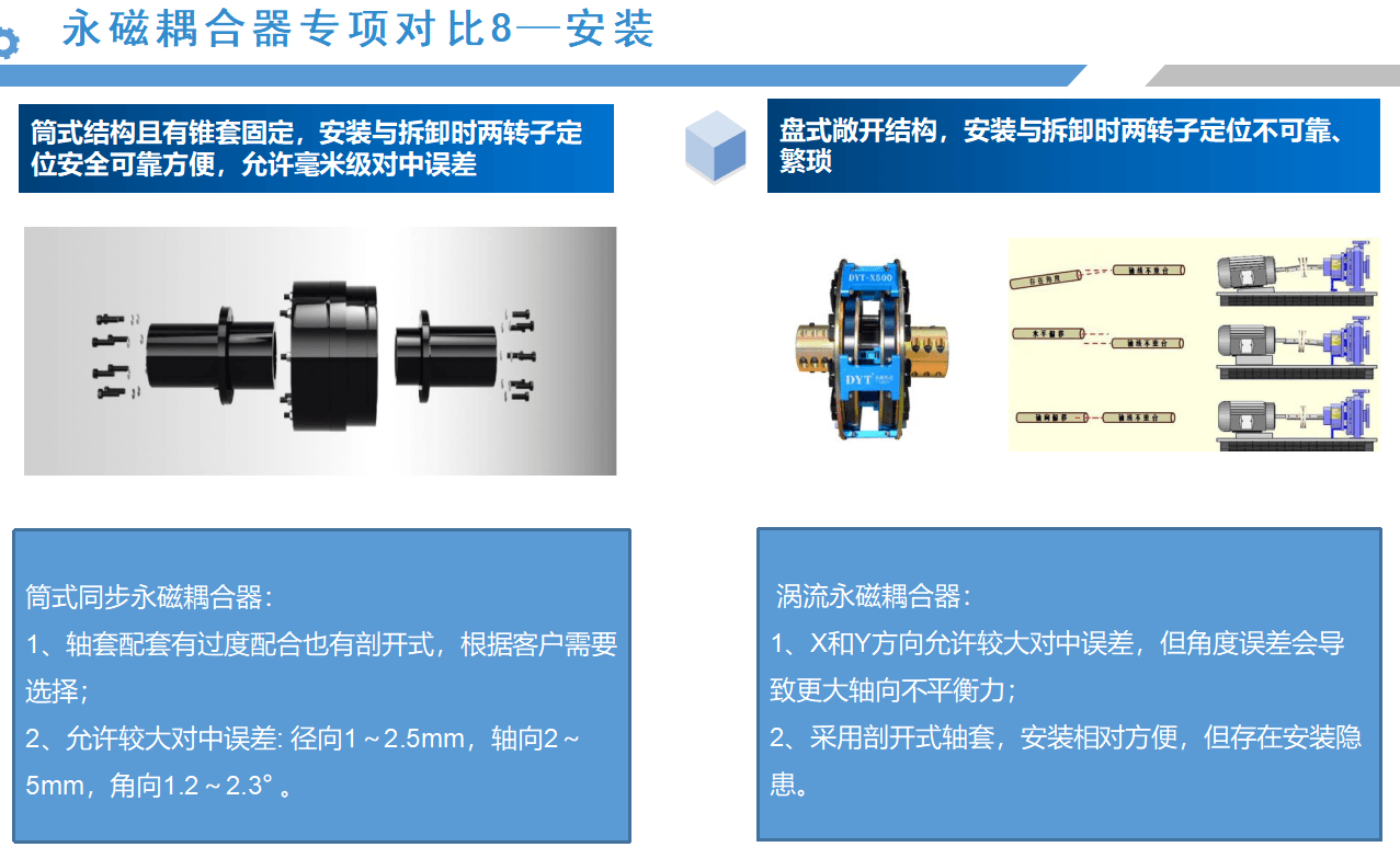 從以上的應(yīng)用案例來(lái)看,同步永磁耦合器的應(yīng)用效果會(huì)比較明顯,接下來(lái),我們通過(guò)數(shù)據(jù)對(duì)比的形式,具體分析筒式同步全永磁耦合器與渦流永磁耦合器優(yōu)劣勢(shì):